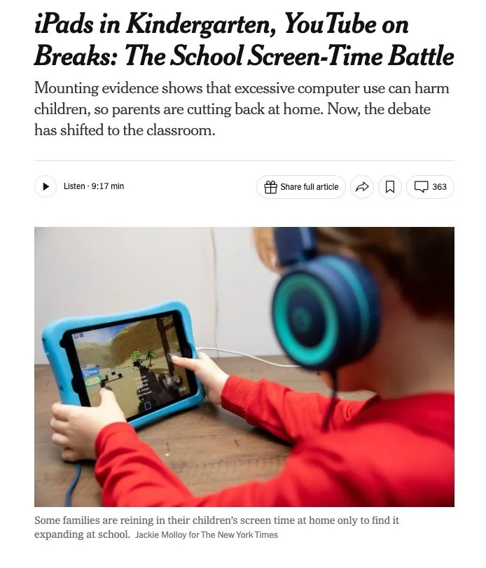 These ideas are echoed in a recent New York Times article about screen use in schools. Across the United States, many parents are beginning to question how much time students spend on devices during the school day. The article describes classrooms where tablets or laptops are used for a wide range of activities, sometimes including watching videos during snack time or transitions between lessons. Parents who expected limited device use were surprised to find that screens appear frequently throughout the day. Some families say the amount of screen time feels excessive, especially for younger students. In one example, parents discovered that their kindergarten child was exposed to advertisements and videos during school activities. For families that had carefully limited technology use at home, the shift was unsettling.